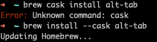 개발 잘 하고 싶다 => 알고 쓰자/ERROR(삽질) 모음 [mac] Unknown command: cask 장 상 현 2021. 11. 8. 목차 기존 brew cask install brew cask install 이었던 명령어 brew install --cask 로 변경! 공유하기 게시글 관리 모르면 마법, 알면 기술 저작자표시 비영리 변경금지 (새창열림) '개발 잘 하고 싶다 => 알고 쓰자 > ERROR(삽질) 모음' 카테고리의 다른 글 [postgresql] psql: error: connection to server on socket "/tmp/.s.PGSQL.5432" failed: No such file or directory Is the server running locally and accepting connections on that socket? (0) 2023.06.30 [Git] Updates were rejected because the tip of your current branch is behind (2) 2021.12.03 [Git] error: Pulling is not possible because you have unmerged files. (0) 2021.08.05 [MySQL] time_zone 설정 (그리니치 표준시 -> 한국시간) (4) 2021.07.31 [MySQL] Access Denied for User 'root'@'localhost' (using password: YES) 에러 해결 방법 (5) 2021.07.28 댓글